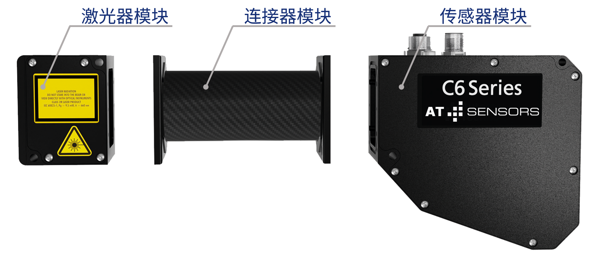 出厂组装及预校准3D激光三角传感器,包括: ● 传感器模块 ● 激光器模块 ● 连接器模块