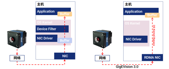 RDMA工业相机直接把图像数据写入主机系统内存,绕过CPU与TCP/IP协议栈,突破CPU高占用率的瓶颈,释放资源,使算力集中于复杂的图像算法及深度学习,传输效率高。